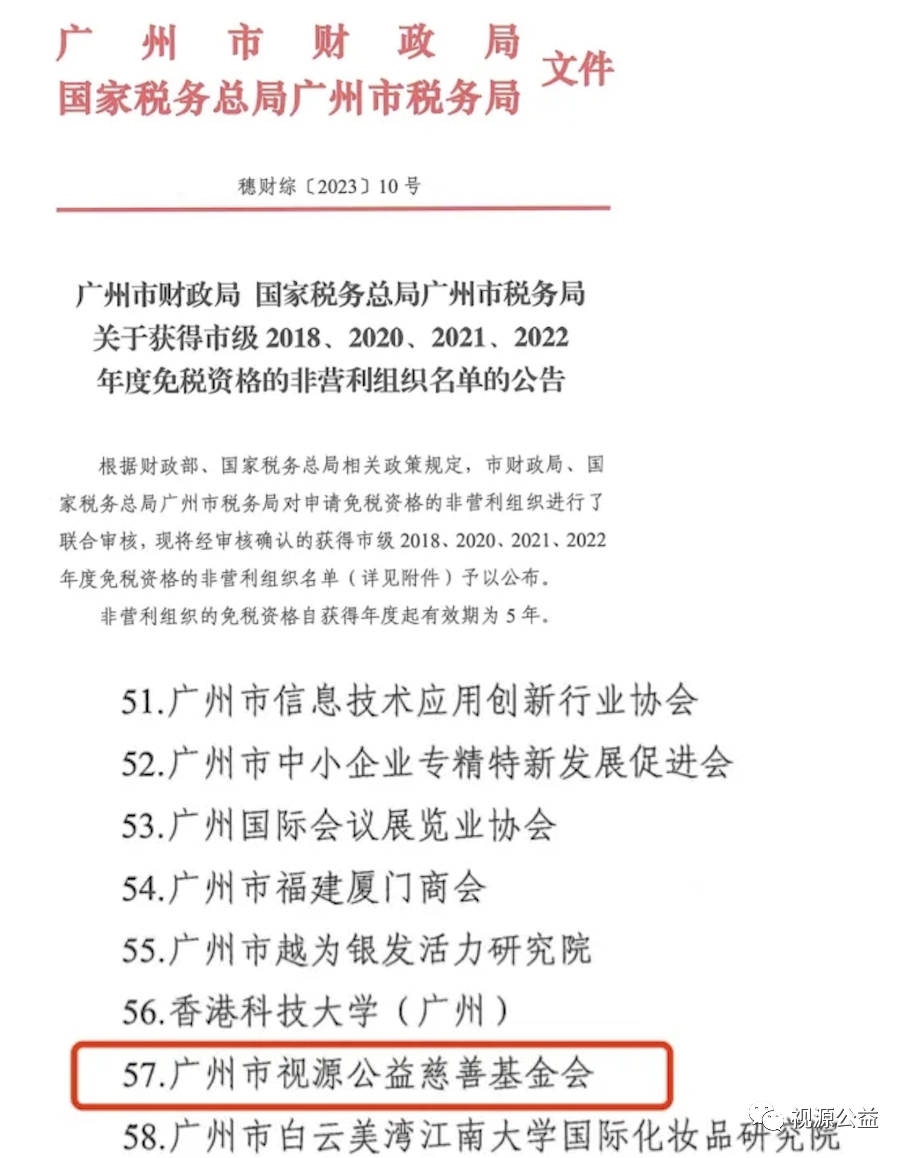 根据财政部、国家税务总局相关政策规定,广州市财政局、国家税务总局广州市税务局对申请免税资格的非营利组织进行了联合审核,并确定公布了获得市级2018、2020、2021、2022年度免税资格的非营利组织名单。广州市视源公益慈善基金会顺利获得2022~2026年度免税资格。