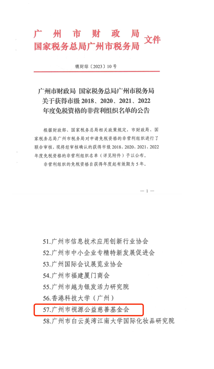 广州市视源公益慈善基金会顺利获得2022年度免税资格。非营利组织免税资格自获得年度起有效期为5年。